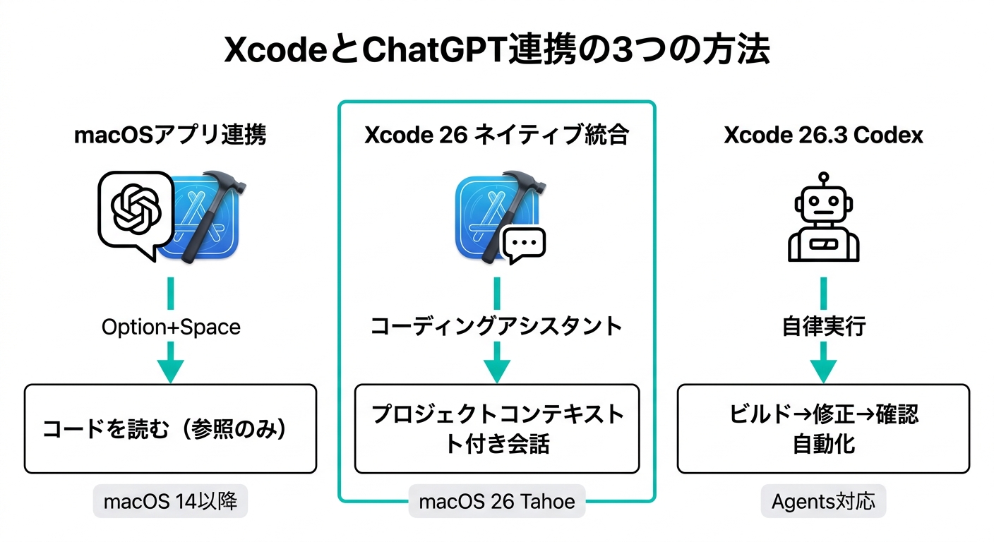 室谷最後に整理しましょう。2026年4月時点でのXcodeとChatGPT連携には3つの方法があります。