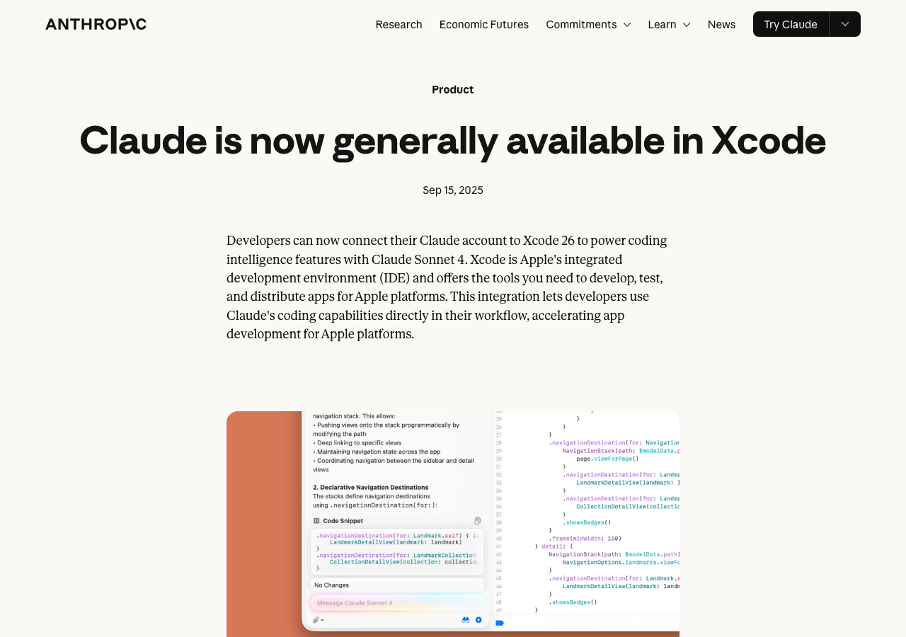 - Xcode 26(2025年9月): Claude Sonnet 4がXcodeのIDE内に統合。コーディングアシスタントとしてコードの質問・修正・ドキュメント生成が可能に