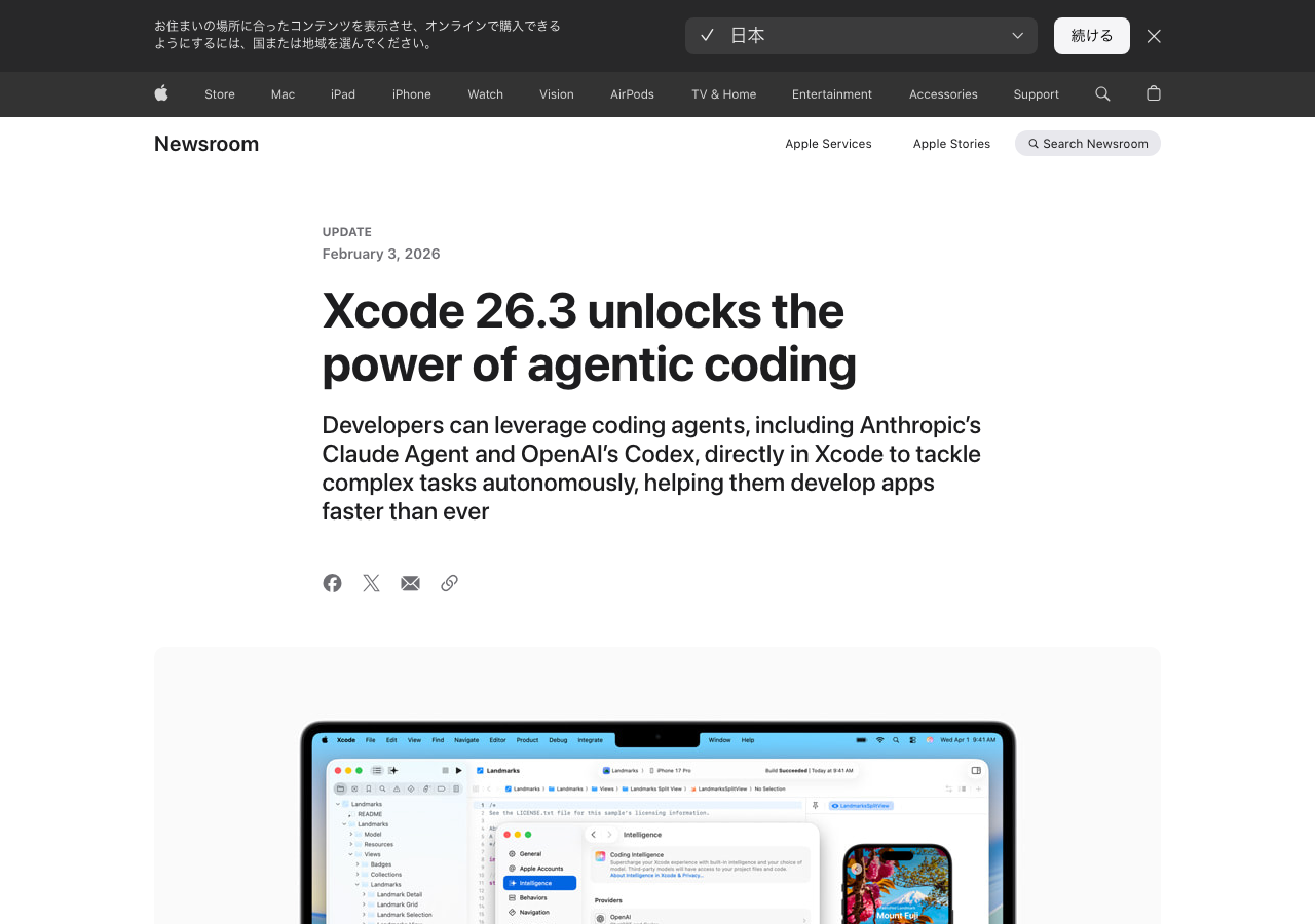 テキトー教師2026年2月3日にAppleとAnthropicが共同で発表した機能ですね。Appleのニュースルームでも「Xcode 26.3 unlocks the power of agentic coding」というタイトルで発表されています。