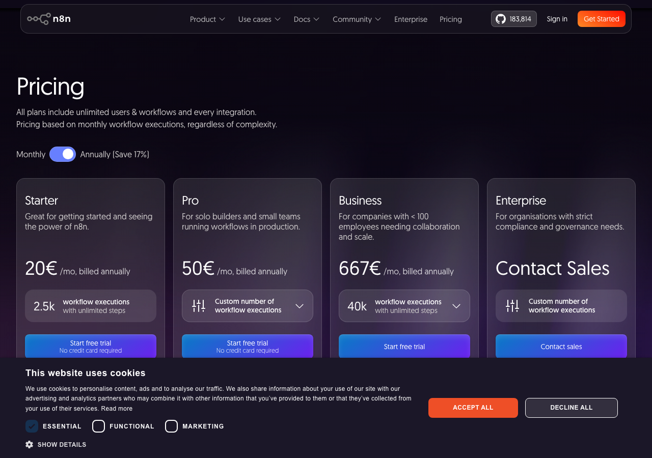 テキトー教師n8n自体の料金も考慮に入れる必要があります。n8nのStarter planが月$20(年払い)で2,500ワークフロー実行/月まで。