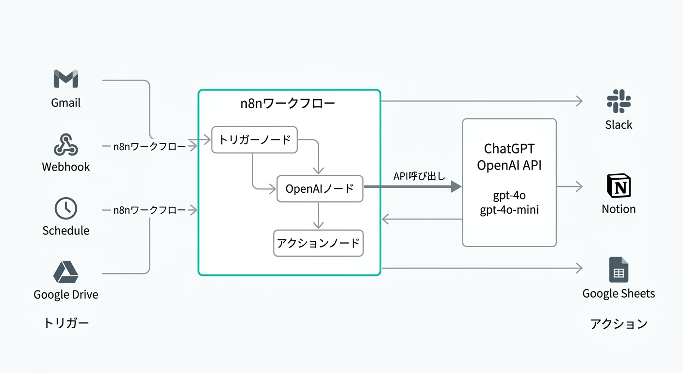 - ノード構成: トリガー(Webhook/Schedule)→ OpenAIノード → Slack/メール通知