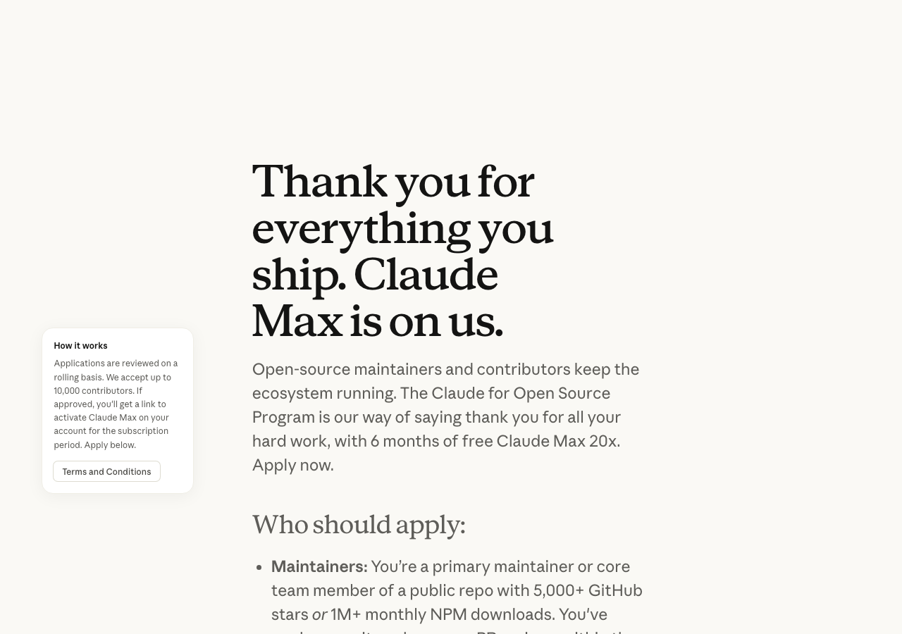 - Claude for Open Sourceプログラムでメンテナーは無料で使える: 5,000スター以上などの条件を満たすOSSメンテナーは6ヶ月間Claude Max 20x(月$200相当)が無料