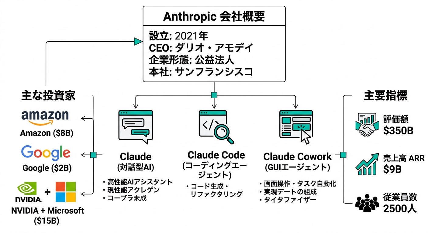 室谷まず基本情報から整理しましょう。Anthropicは2021年1月にアメリカ・サンフランシスコで創業した、AIの安全性を研究・開発する公益法人です。