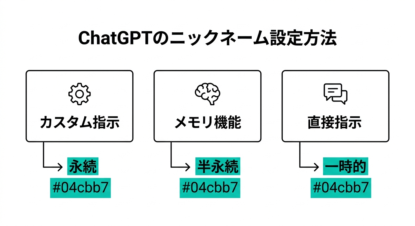 - ニックネームの設定先: カスタム指示が一番確実。メモリは補助的に使う
