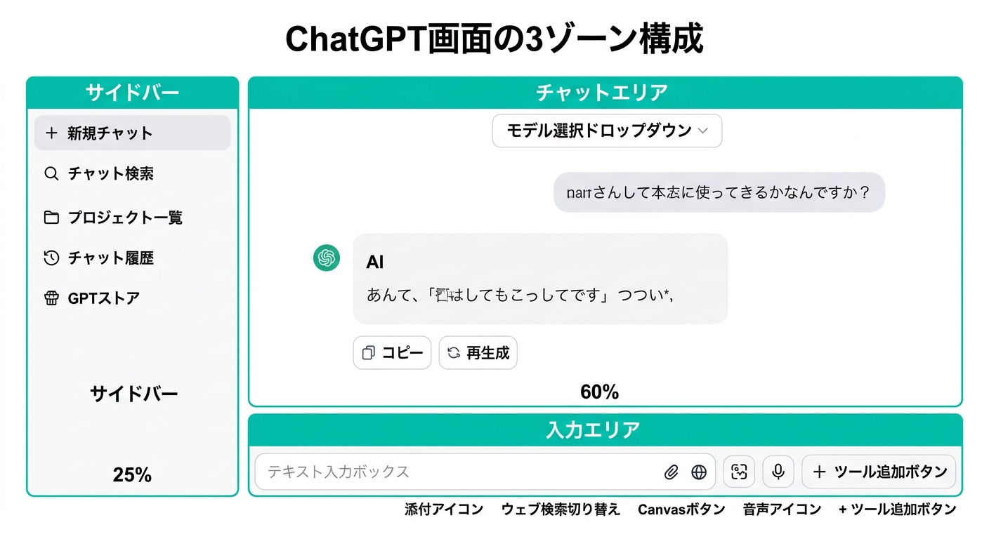- ChatGPTの基本構造:サイドバー・チャットエリア・入力エリアの「3ゾーン」