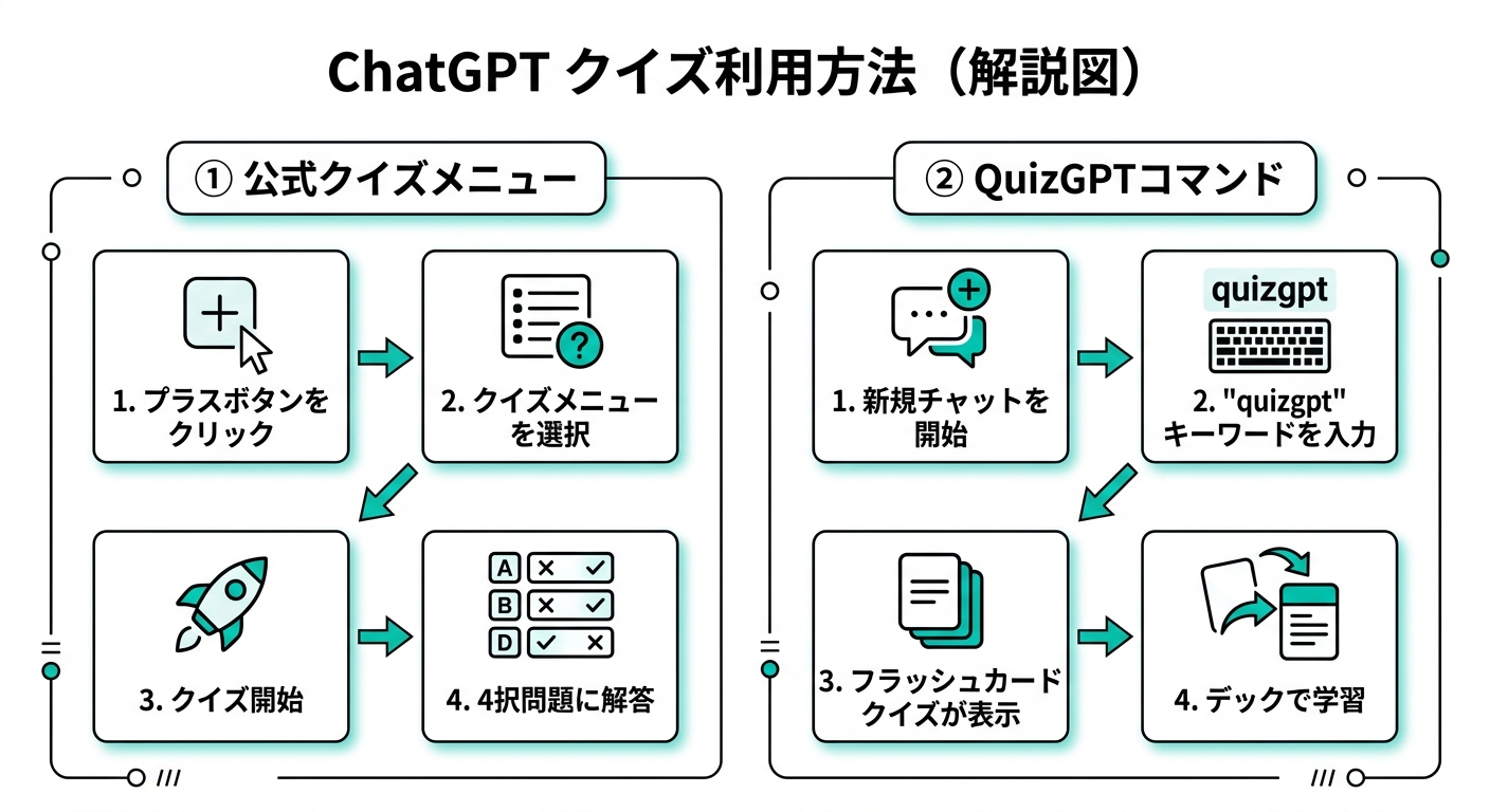 テキトー教師まずは「ChatGPTのクイズ機能には2つの使い方がある」という前提を整理したいと思います。1つ目はメニューから使える公式クイズ機能、2つ目はプロンプトでクイズを自由に作成する方法です。