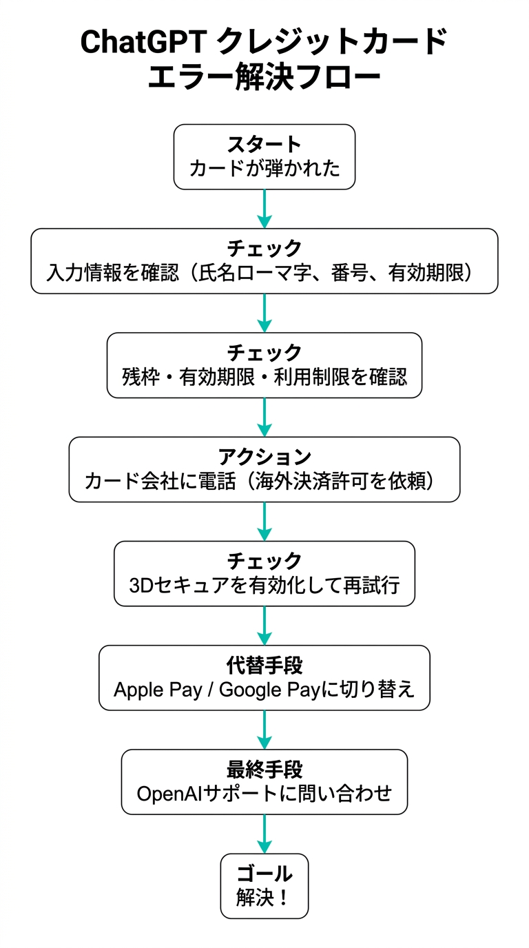 テキトー教師上のすべてを確認しても通らない場合は、最終手段としてOpenAIのサポート()に問い合わせる形になります。問い合わせる際は、どのエラーメッセージが出たか、どのカードを使ったか、を具体的に伝えると対応が早いです。