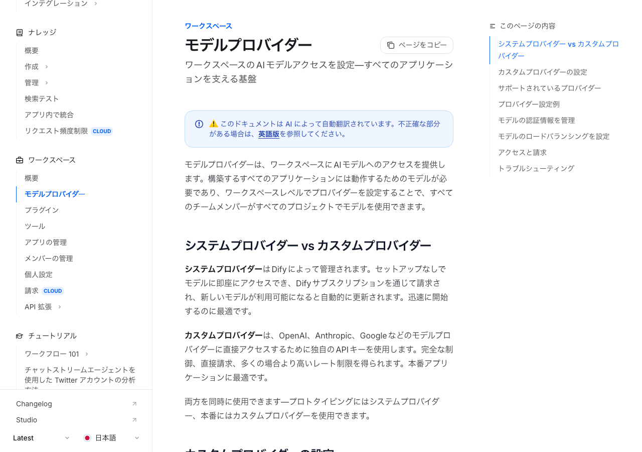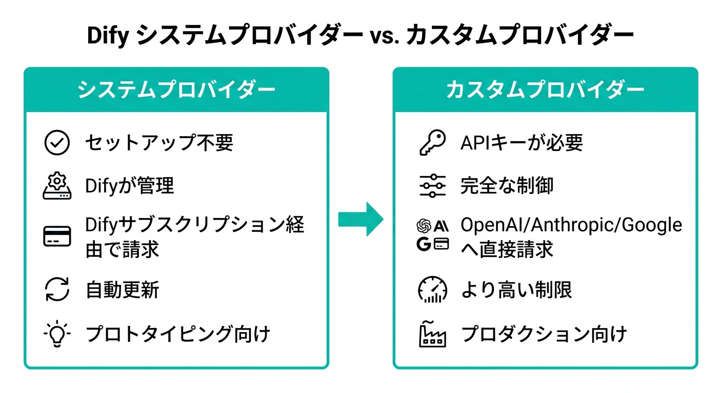 - システムプロバイダー:設定不要でDifyが管理。プロトタイプ向け