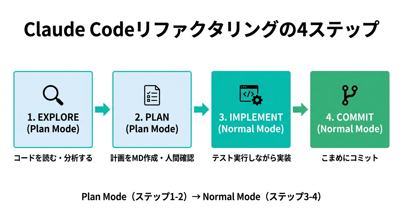 室谷じゃあ、実際にどういう手順でリファクタリングを進めるかを説明しましょう。公式ドキュメントで推奨されているフローがあって、「Explore → Plan → Implement → Commit」の4ステップです。