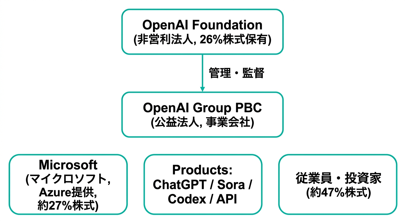 - 主要株主: OpenAI Foundation(26%)、Microsoft(約27%)