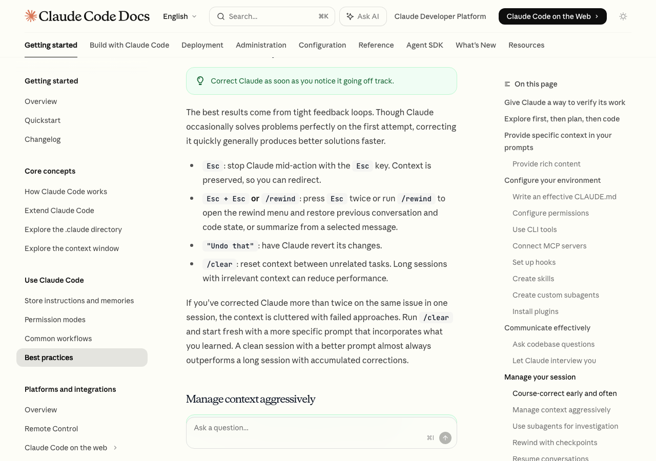 - CLAUDE.mdは必要最小限に: 長すぎるCLAUDE.mdはそれ自体がコンテキストの重荷になる