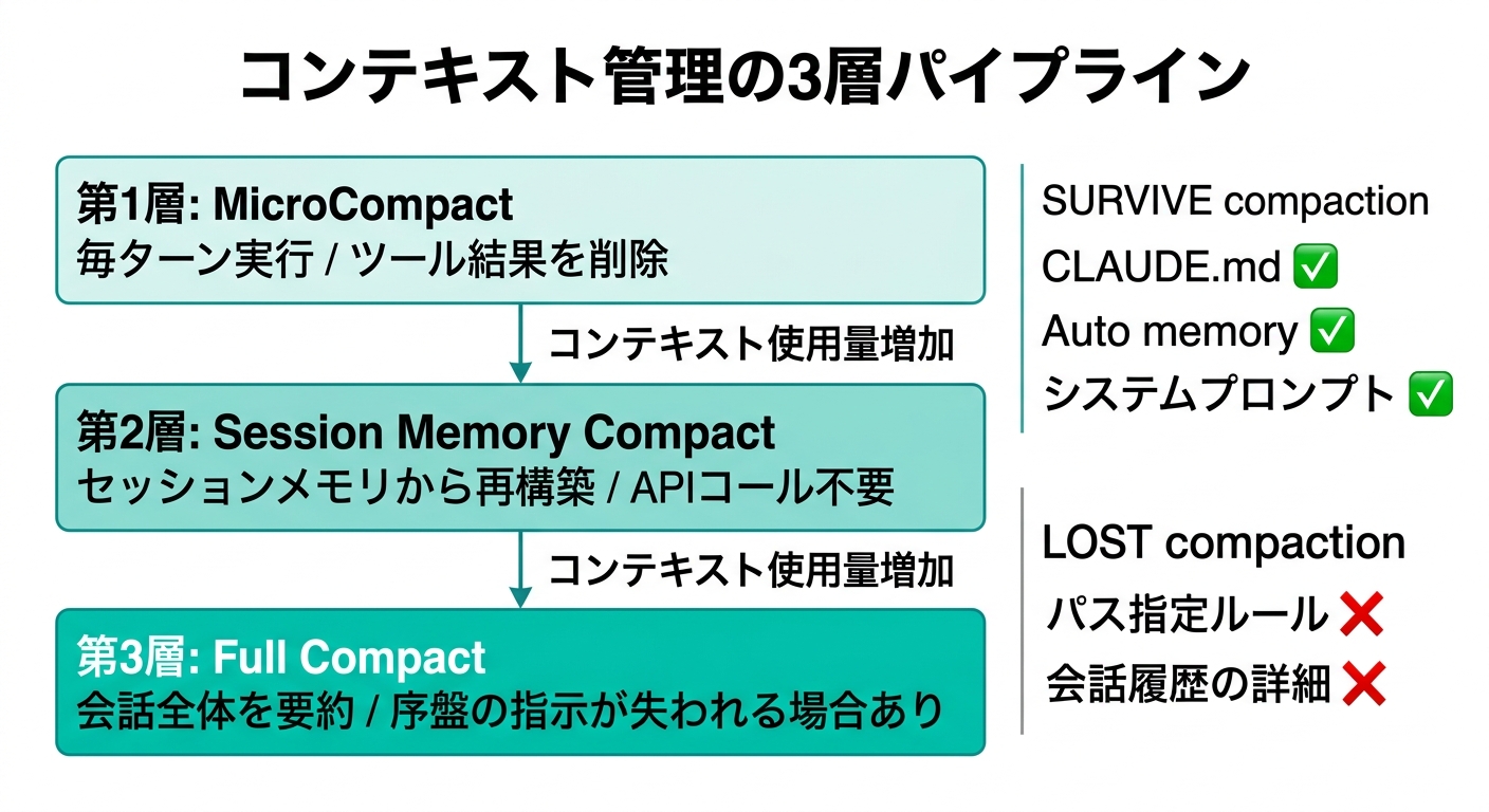 第2層: Session Memory Compact(セッションメモリコンパクト) セッションメモリファイルから文脈を再構築します。モデルへのAPIコールが不要なため、コストが安いのが特徴です。