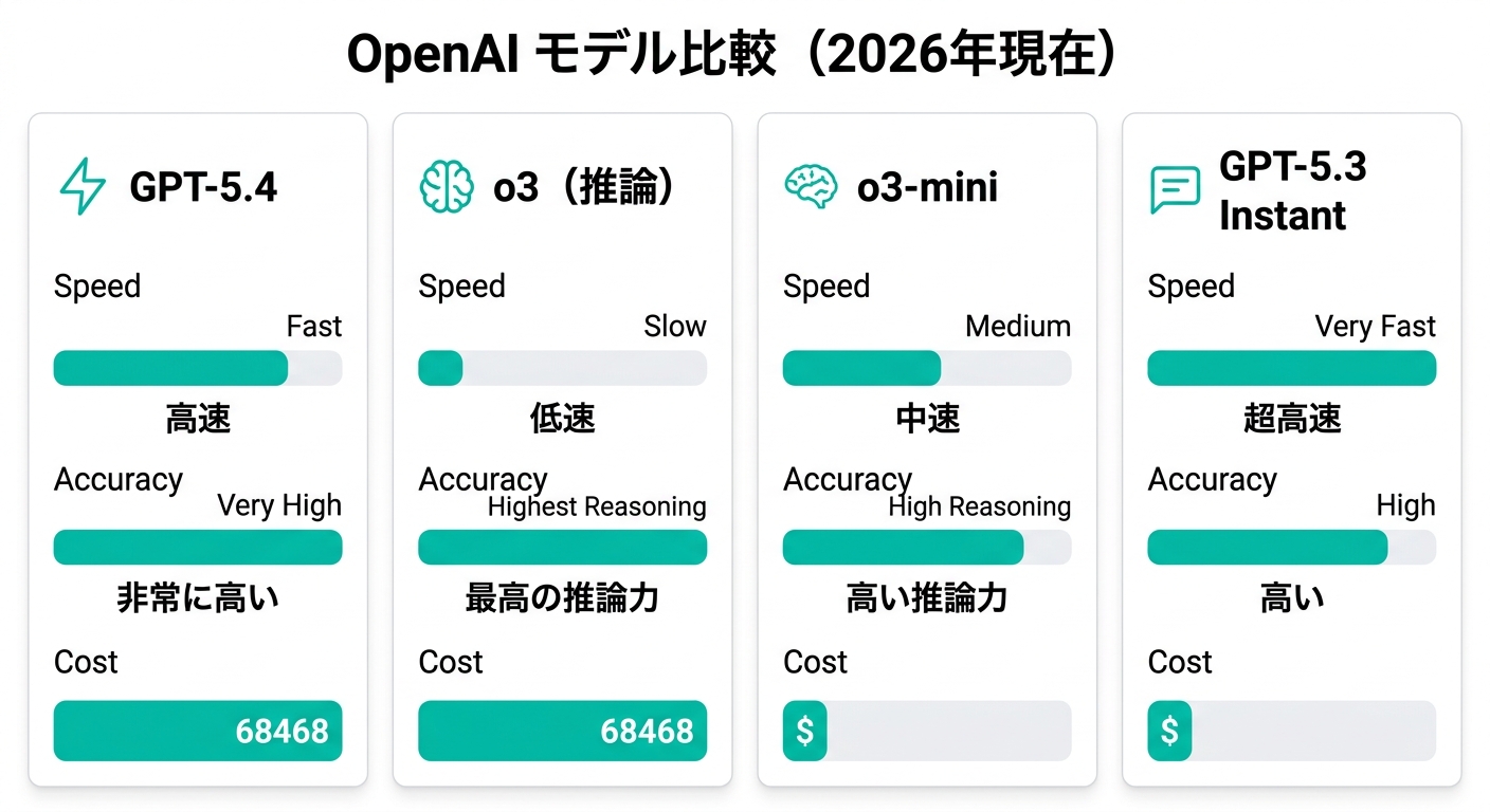 室谷結局「何をしたいか」によって最適なモデルは変わります。深い推論が必要なタスクにはo3(またはo3-mini-high)、汎用的な作業にはGPT-5.4やGPT-5.3 Instant、という整理が2026年現在もシンプルで実用的だと思います。