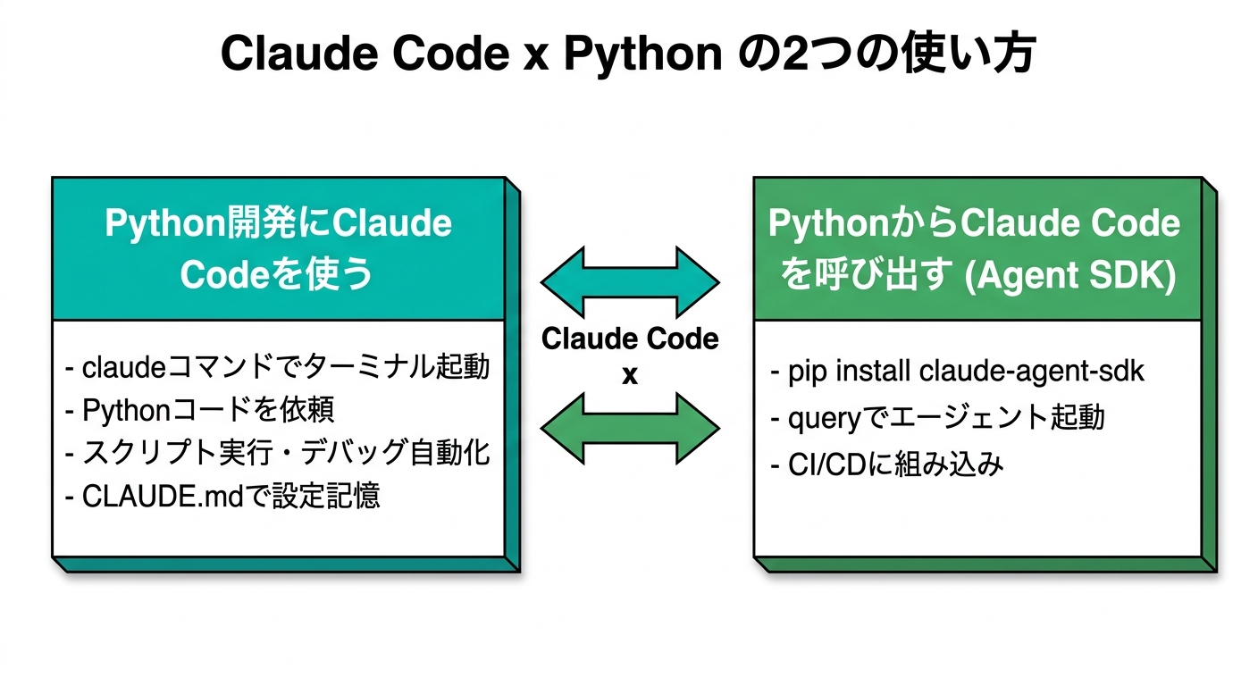 室谷そこが重要なポイントで、整理すると「Claude CodeのターミナルでPythonを使う話」と「Claude Agent SDKをPythonから呼び出す話」の2つがあるんですよね。どちらも「Claude Code × Python」ですが、目的が全然違います。