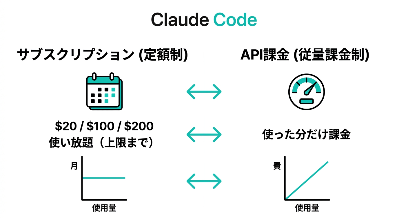 室谷ここ、めちゃくちゃ重要なポイントなんですよね。Claude Codeを使う方法は大きく「サブスクリプション(定額)」と「API課金(従量課金制)」の2つがあります。