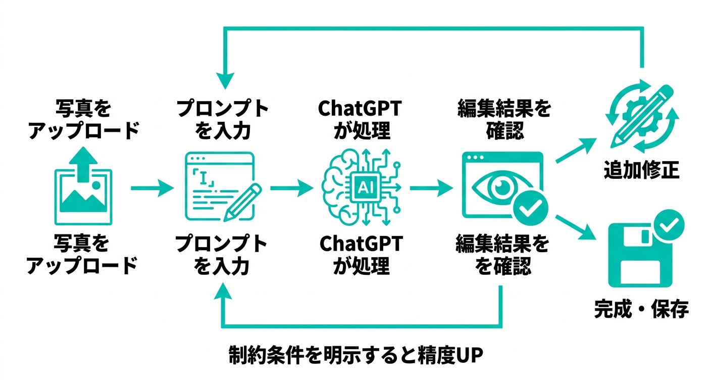 テキトー教師教える立場から見ると、ここで重要なのは「ChatGPTが得意な写真編集」と「苦手な写真編集」をちゃんと理解してから使うことです。この前提がないと、プロンプトに時間をかけてもうまくいかないことが多い。