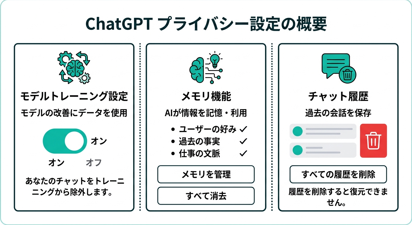 1つは「モデル改善への利用(あなたの会話をAIの訓練データに使うかどうか)」、もう1つは「メモリ機能(ChatGPTがあなたの好みや情報を記憶するかどうか)」です。