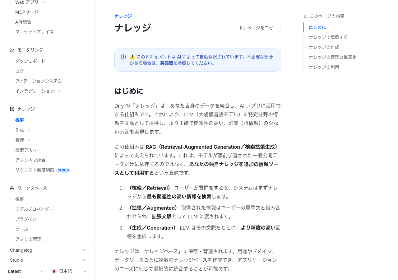 室谷Difyの公式ドキュメントにも明確に書かれているんですが、ナレッジ機能は「LLMに特定分野の情報を文脈として提供し、より正確で関連性の高い回答を実現する仕組み」と説明されています。「学習させる」ではなく「文脈として提供する」という表現を使っているのがポイントです。