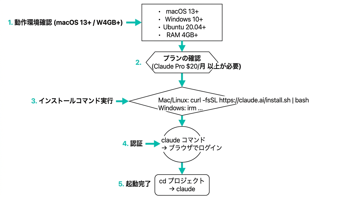 室谷Claude Codeの起動まわりをまとめると、ポイントは3つですね。まず、ProプランかMax以上が必要。