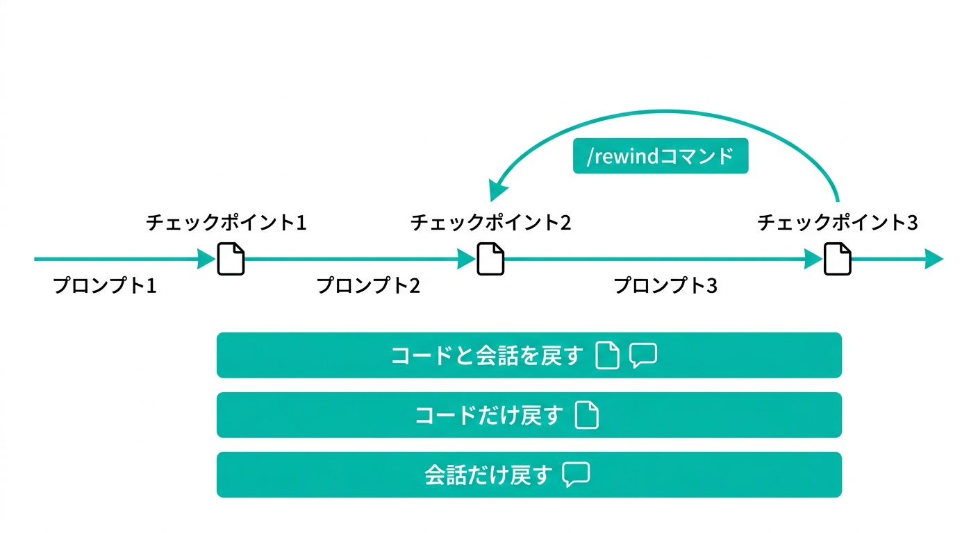 | /rewind | チェックポイント一覧 | Esc+Esc または /rewind |