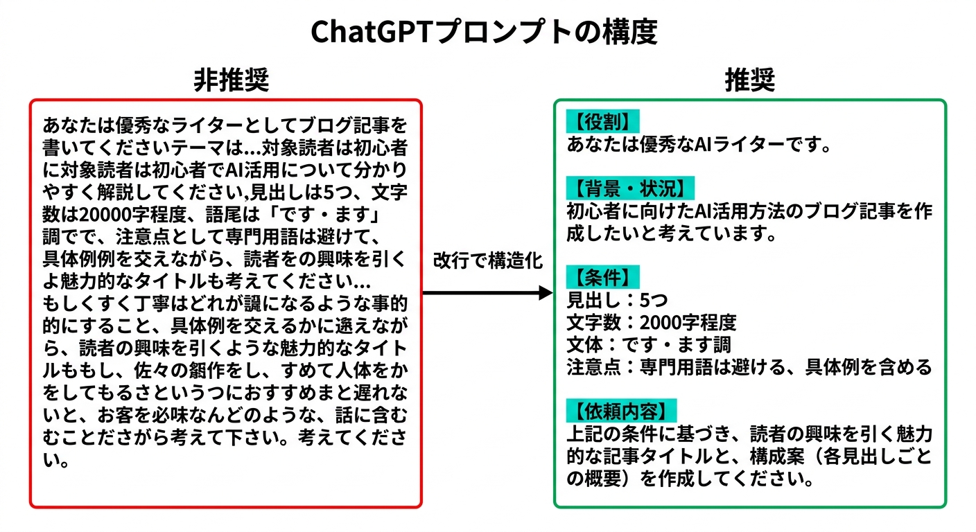 - 改行で構造化したプロンプトは回答の質が上がる