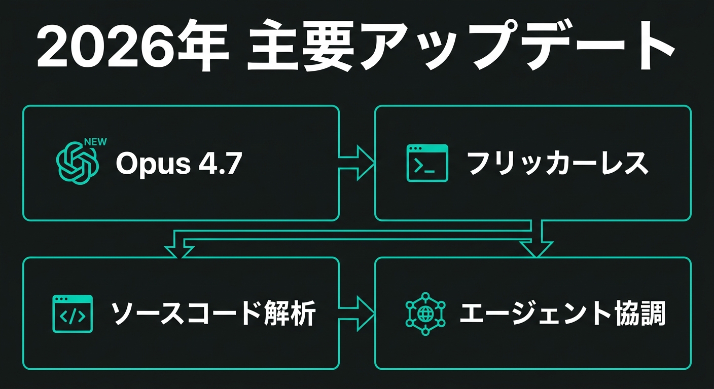 Claude Codeニュース2026年完全まとめ:Opus 4.7・フリッカーレス・ソースコード流出まで追いかける
