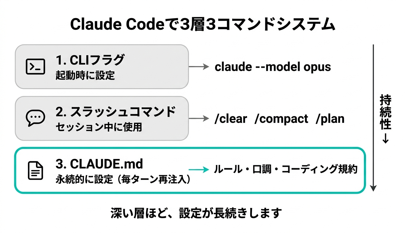 永続的に毎回使いたいなら「CLAUDE.mdに書く」。この3層構造が大事です。