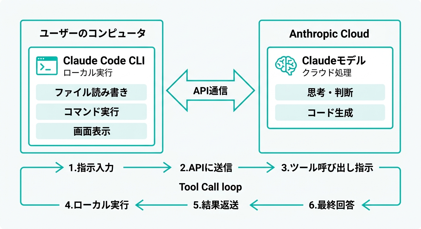 | Claude Codeクライアント | あなたのPC(ローカル) | ファイル読み書き、コマンド実行、画面表示 |