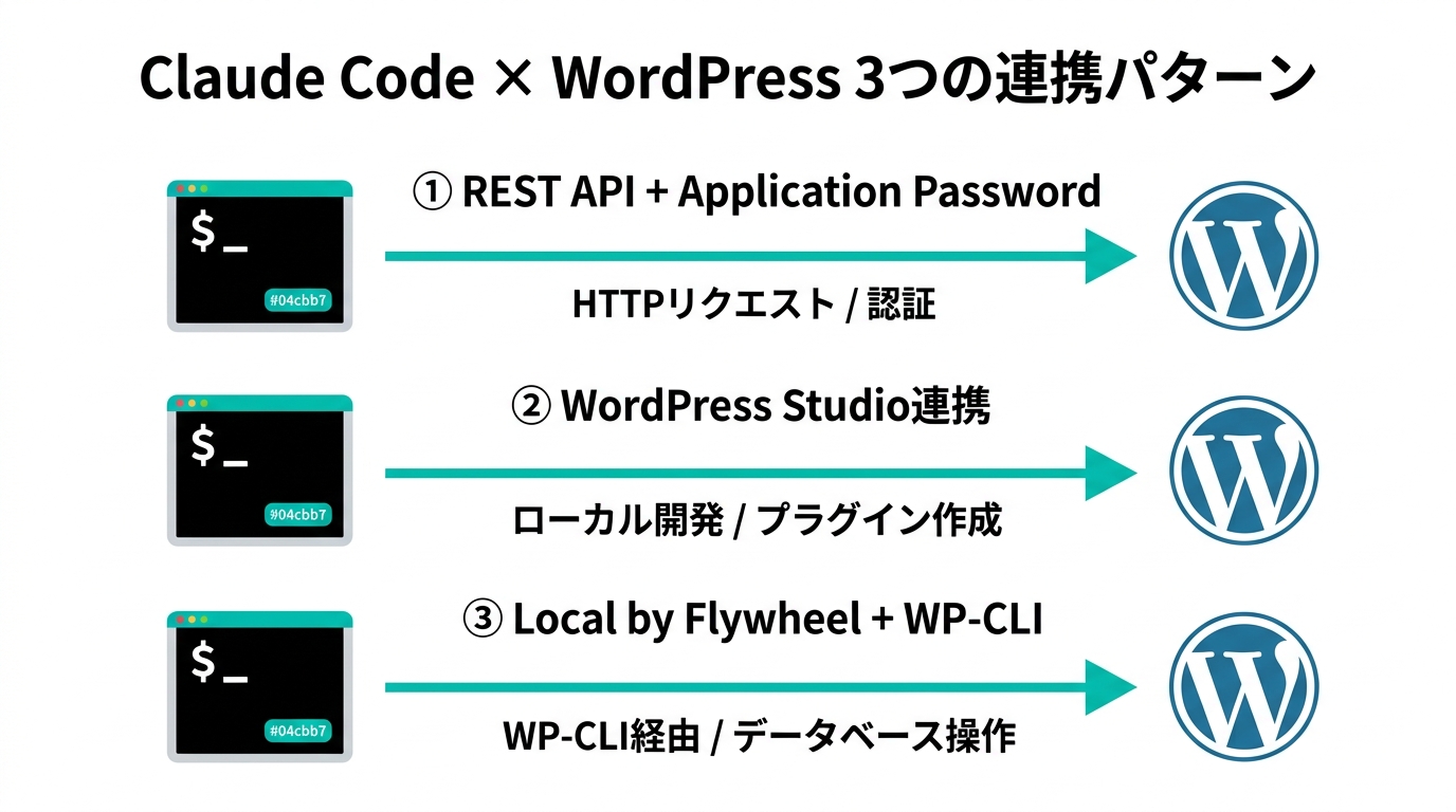 室谷ここから具体的な話に入ります。Claude CodeとWordPressをつなぐ方法は、大きく3つのパターンに整理できるんですよね。