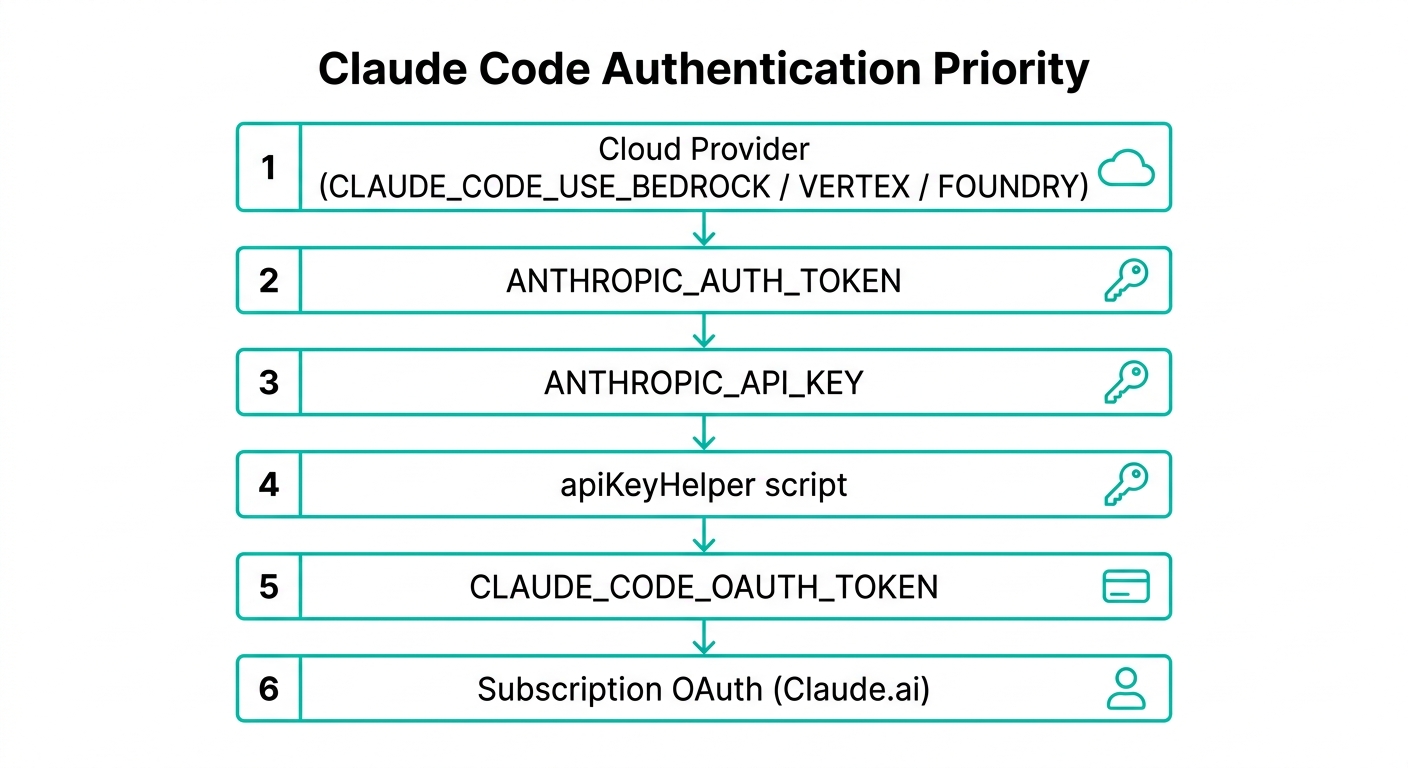 ANTHROPIC_AUTH_TOKEN、ANTHROPIC_API_KEY、apiKeyHelper スクリプト、OAuth (Claude.aiサブスクリプション) という順番です。Google Vertex AIで使う場合