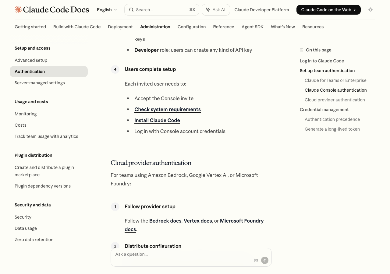 Claude Code ロールか Developer ロールをもらう。そのメンバーがAPIキーを発行してClaude Codeに設定する、という流れです。# APIキーを環境変数に設定