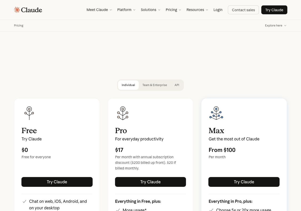 室谷$20から始めて、使い込んでいくと自分の使用量の傾向がわかってきます。2週間使えば「自分にはProで十分かMaxが必要か」の判断が付きます。