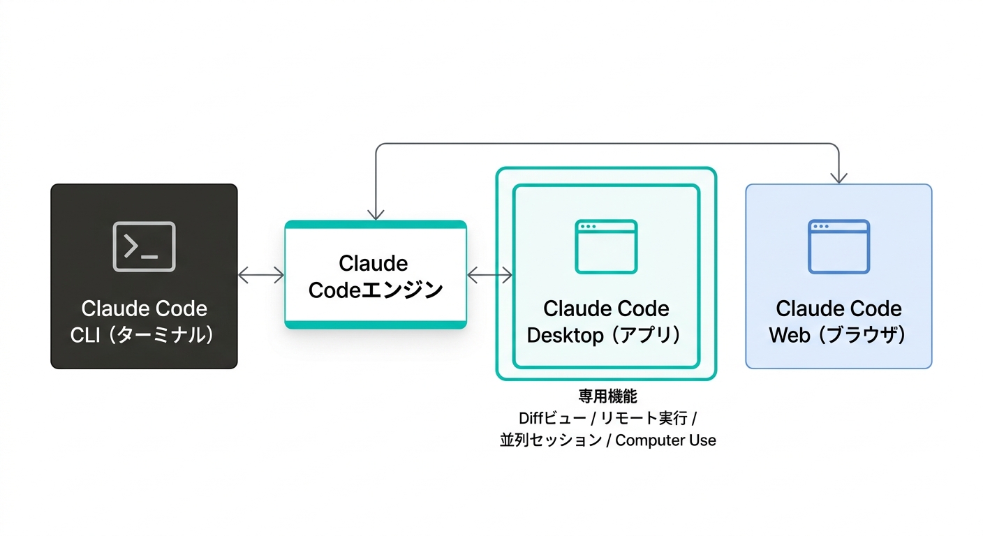 テキトー教師講座でも初日に出てくる質問ですね。「ターミナルで使うClaude Codeと、デスクトップアプリで使うClaude Code Desktopって、別物なんですか?」って。
