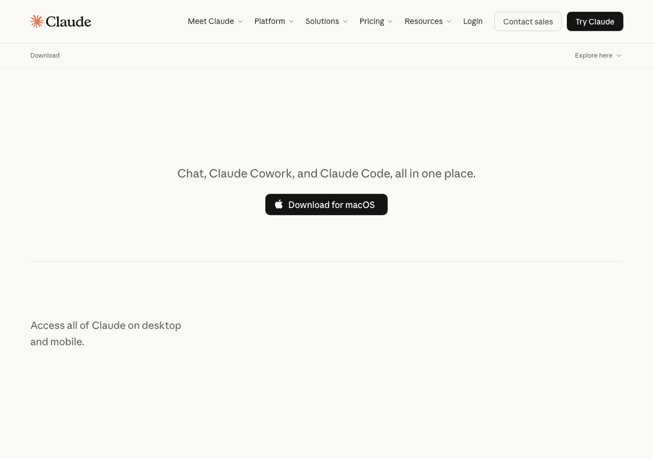 室谷簡単に言うと「Claude Desktopアプリ」はコンテナで、その中の「コードタブ」がClaude Code Desktopですね。アプリのダウンロードページには「Chat, Claude Cowork, and Claude Code, all in one place.」と書いてあって、3つが一つのアプリに入っているというイメージです。