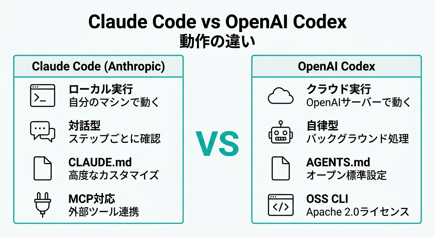 | 設定ファイル | CLAUDE.md(独自形式) | AGENTS.md(オープン標準) |