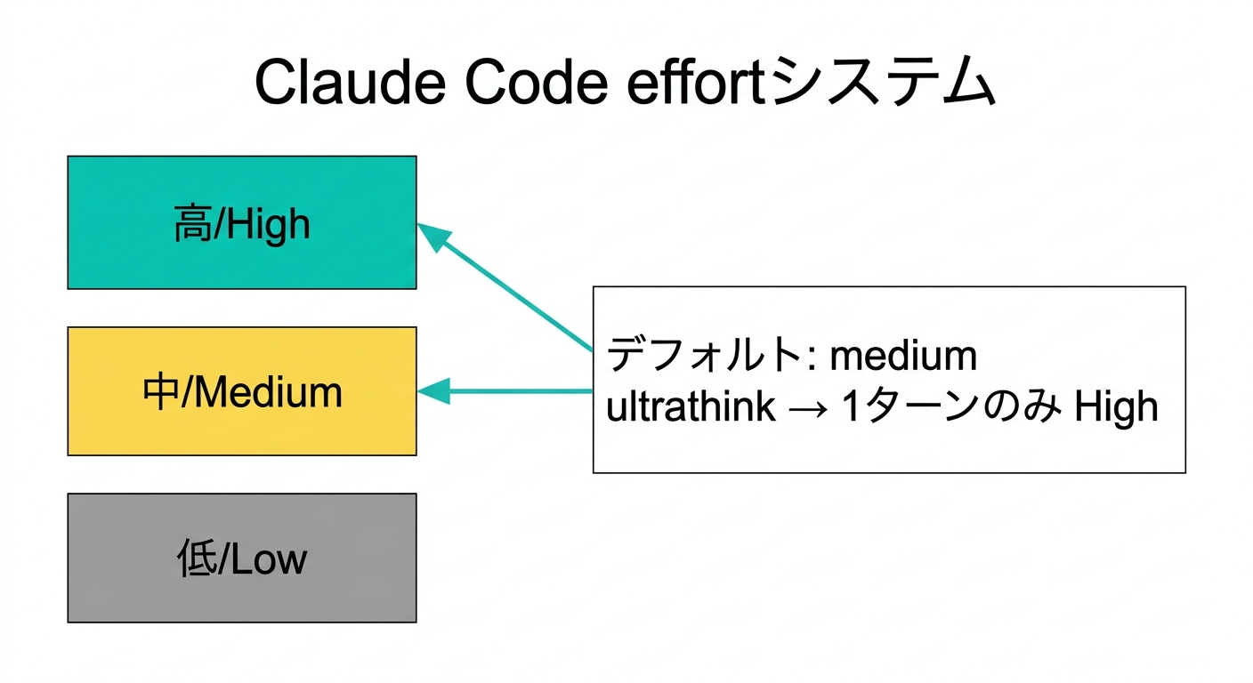 室谷Claude Codeには現在「low」「medium」「high」の3段階のeffortがあります。2026年3月のv2.1.68では、MaxプランとTeamプランのOpus 4.6ユーザーに対して、デフォルトのeffortが「high」から「medium」に変更されました。
