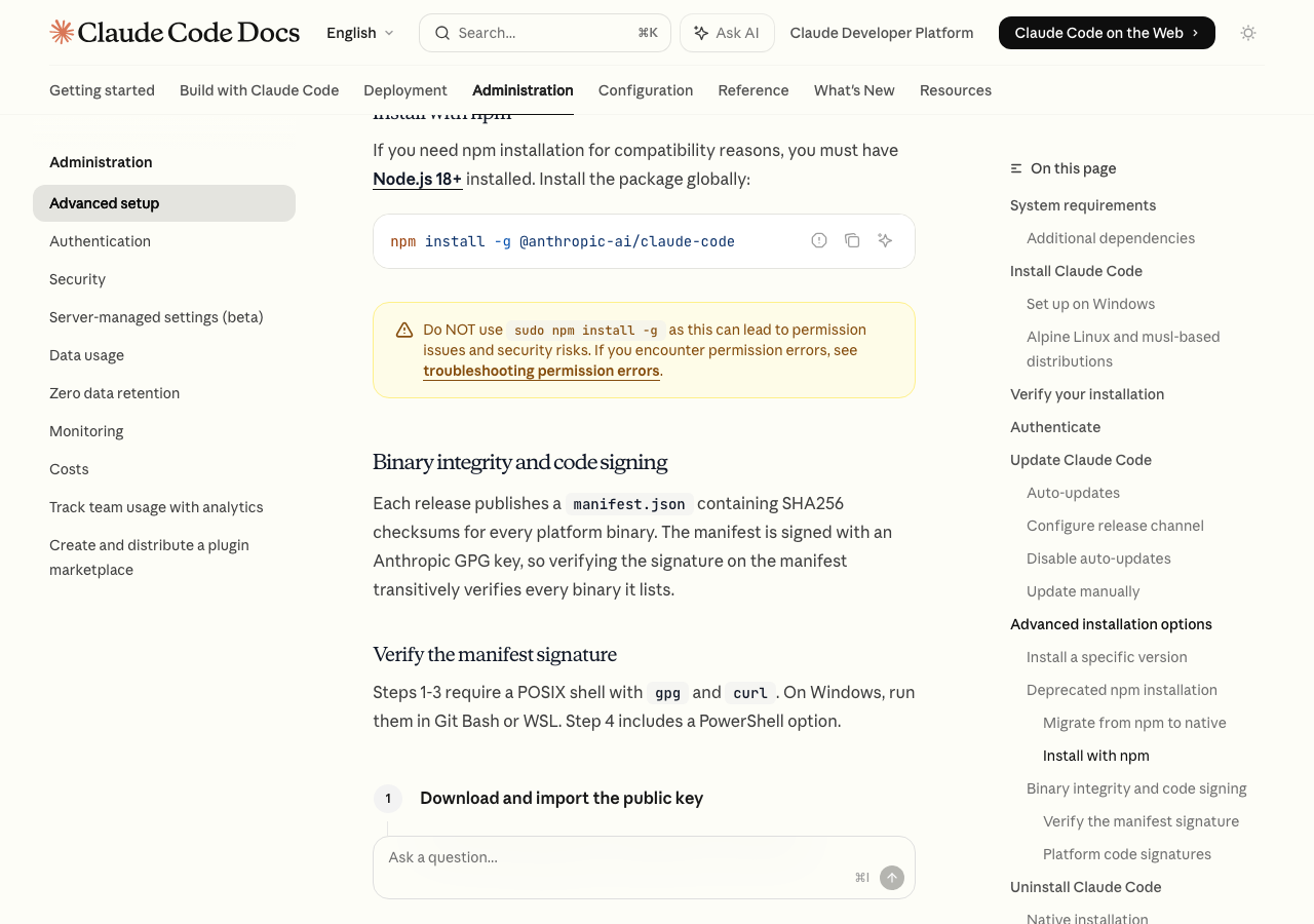 テキトー教師確かに、公式ドキュメントにはバイナリの整合性検証(manifest.jsonのSHA256チェックサムとGPG署名)の手順が詳しく書かれるようになりましたよね。npmだとそこまでの署名検証ができなかった。