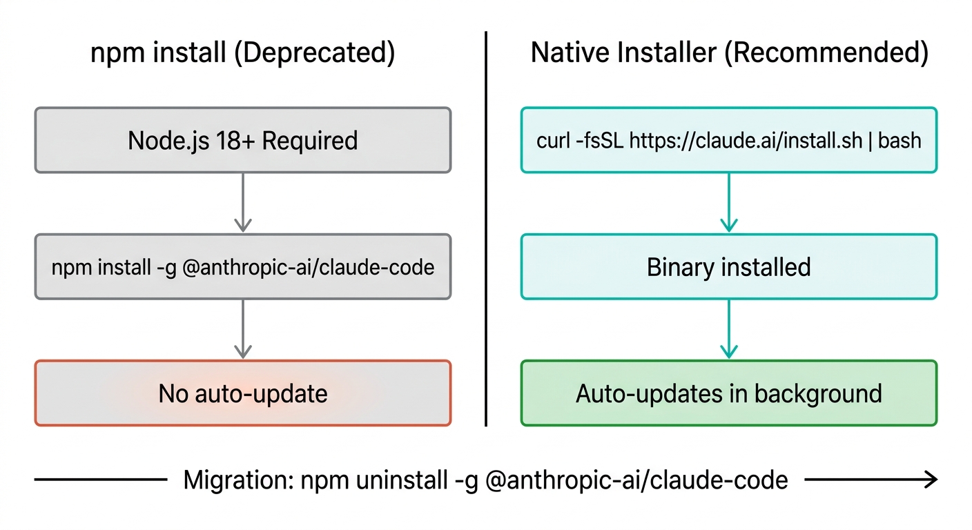 claude installを実行してネイティブバイナリを追加インストールし、その後npmバージョンを削除する方法も紹介されています。