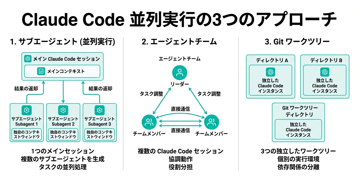 室谷並列実行には3つのアプローチがあります。まず全体像を把握してから、それぞれの詳細に入りましょう。