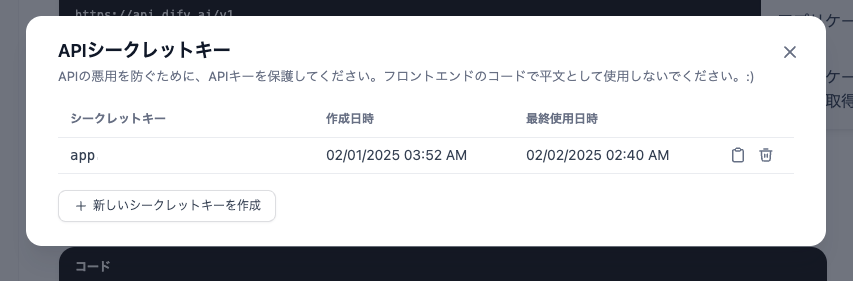 - DifyアプリのAPIキー(Service API Key):外部システムからDifyアプリを呼び出すために必要。アプリごとに発行する。