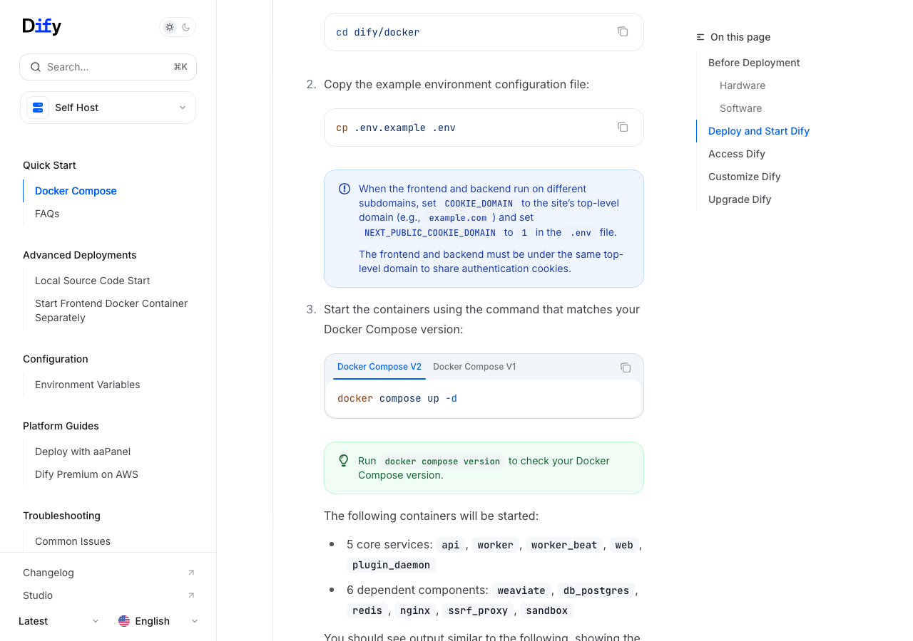 git clone https://github.com/langgenius/dify.git でクローンした後、git tag で確認してから git checkout v1.13.3 のように特定バージョンに切り替えることもできますよ。ステップ2: Docker Composeで起動