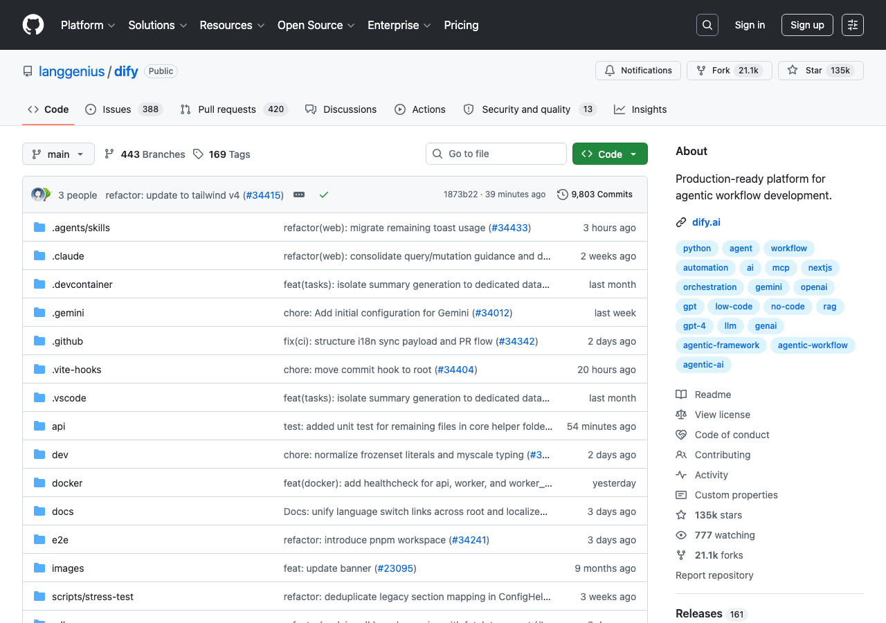 github.com/langgenius/dify なんですが、2026年4月時点で星が13.5万個を超えてるんですよ。オープンソースのLLMアプリ開発プラットフォームとしては世界トップクラスの数字で・・・