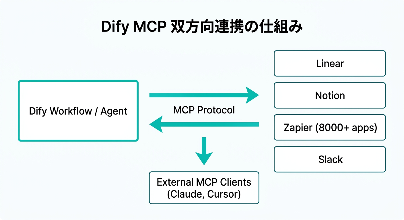 室谷これの何がすごいかというと、「双方向」なんですよね。Difyから外部のMCPサーバーを使える(クライアント側)だけでなく、DifyのワークフローそのものをMCPサーバーとして公開できる(サーバー側)。