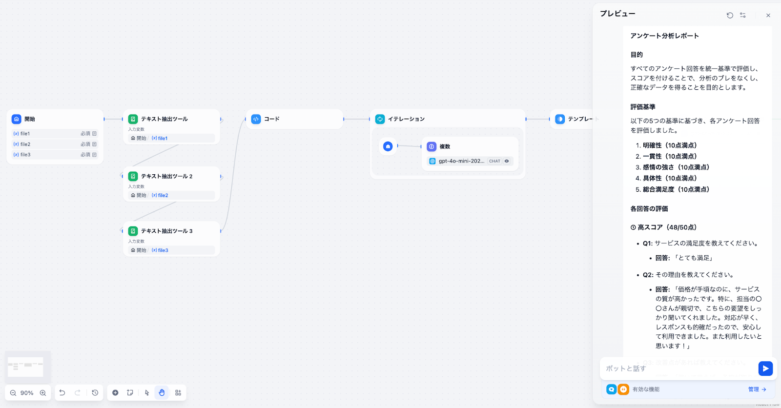 テキトー教師イテレーション内でもLLMノードやコードノードを使えるので、かなり複雑な処理も書けます。「各データを処理して、条件によって分岐して、結果を集約する」という入れ子構造のワークフローも作れます。
