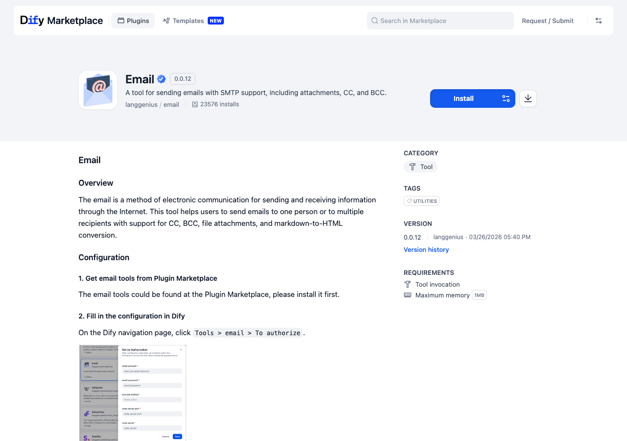 テキトー教師現在はDify Marketplaceで「Email」プラグインを検索すると見つかります。インストール数は2万件以上で、かなり使われていますね。
