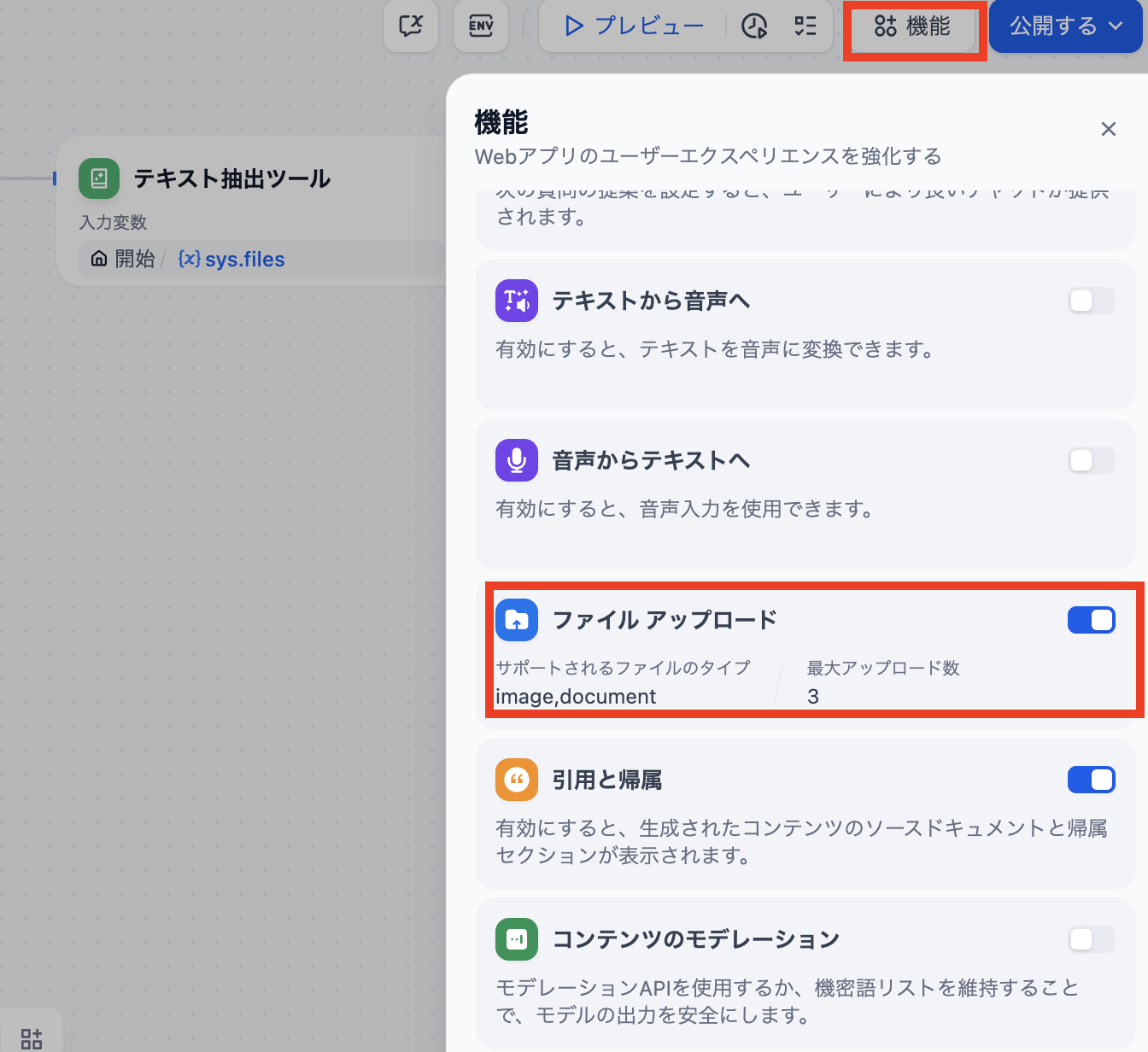 - チャットフローでユーザーにファイルアップロードさせるには「機能」タブで有効化が必要