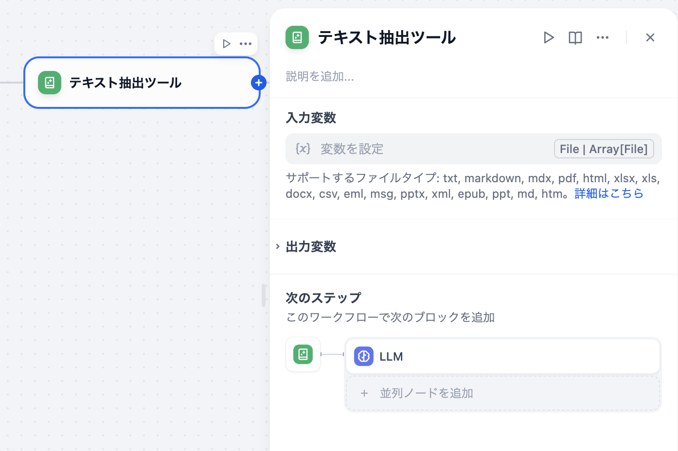 日本語UIでは「テキスト抽出ツール」と表示されます。「テキスト抽出ツールノード」「dify テキスト抽出ノード」「ドキュメントエクストラクター」すべて同じノードを指しています。