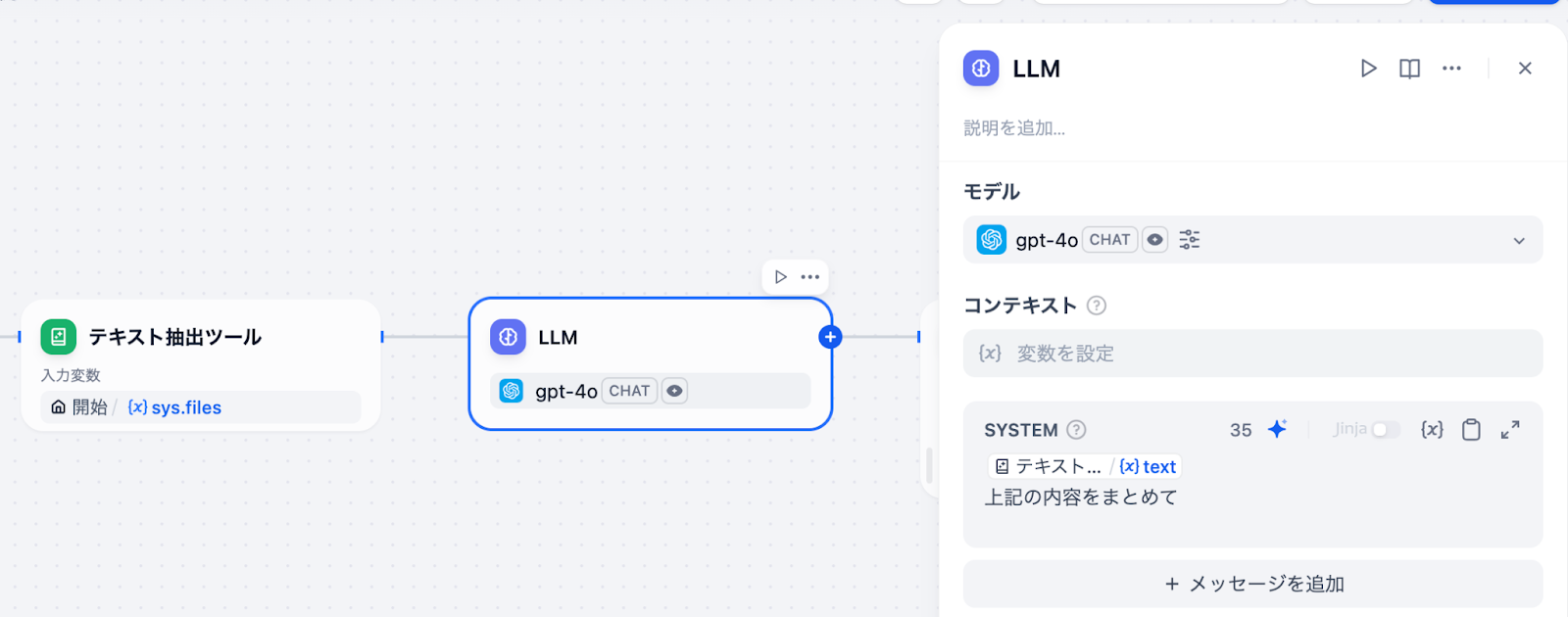 ワークフロー全体の流れは「開始 → テキスト抽出ツール → LLM → 終了」という4ノード構成が最もシンプルなパターンですね。