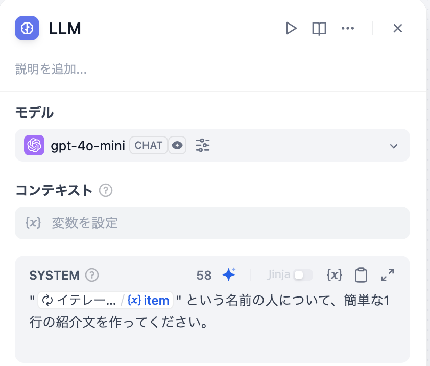 ["田中", "佐藤", "井上"] に対してLLMで紹介文を1件ずつ生成し、3件分の紹介文リストを作る」という処理ですね。イテレーション内のLLMノードでは {{item}} という変数で各要素を参照できます。
