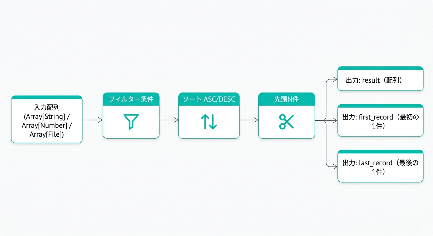 テキトー教師整理すると、リスト処理ノードができることは3つです。フィルタリング(条件に合う要素だけを抽出)、ソート(昇順・降順で並び替え)、先頭N件の取得(最初のN件、または最初・最後の1件)。